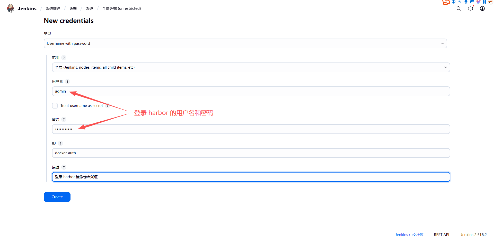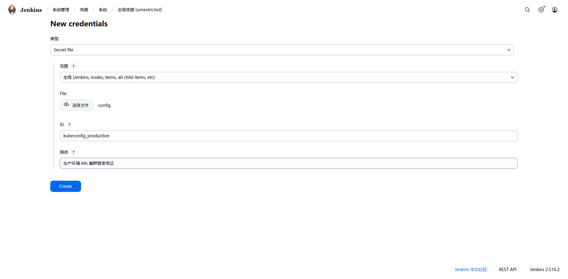 Jenkins 要完成整个流程需要多个凭证,其中在指定的 k8s 集群创建工作节点所需的凭证和在 GitLab 拉取代码的凭证前面已经创建好了。下面还需要创建对接镜像仓库的凭证和部署到不同环境的 k8s 集群的凭证。